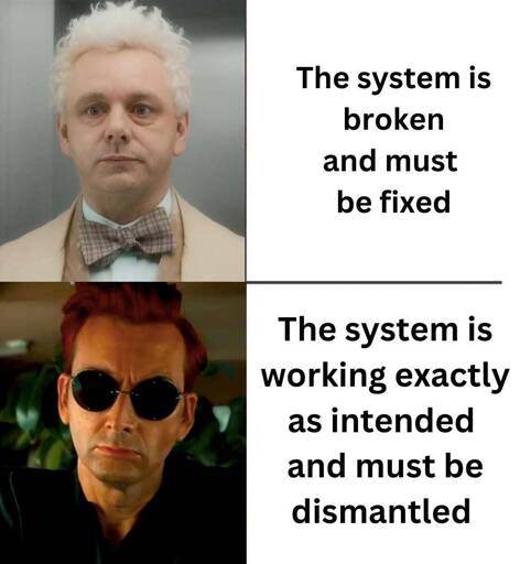 these are not two sides. The system is working as some intend so needs to be dismantled, at least large parts of it, to fix it.
