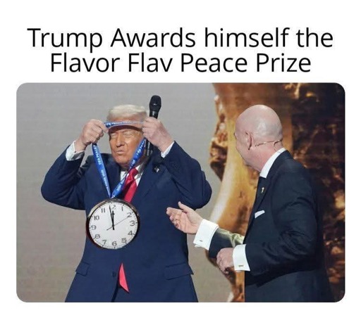 minus-squareHootinNHollerin@lemmy.dbzer0.comlinkfedilinkEnglisharrow-up14·edit-219 days agoIt’s the head of FIFA, giving trump a made up FIFA peace prize likely to get away with corruption