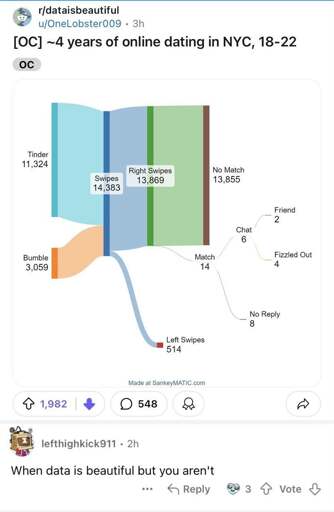 there is no way in all of hell that 14k right swipes led to 14 matches unless the person’s bio literally says they are a sex offender or something insane like that