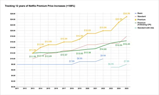 | Year | Basic | Standard with Ads | Standard | Premium | Premium Following CPI | CPI Inflation % |