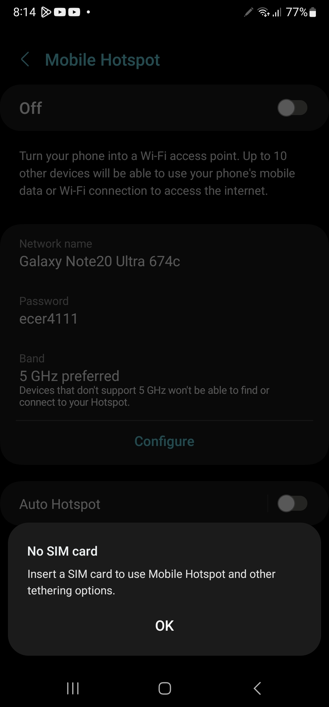 arrow-up1134arrow-down1imageI hate Samsung and their dumb software design choices, and this is one of them. Why do I need a SIM card to enable a hotspot whereas every other phone works without one?lemmy.caColdWater@lemmy.ca to Mildly Infuriating@lemmy.worldEnglish · 6 months agomessage-square69linkfedilinkfile-text