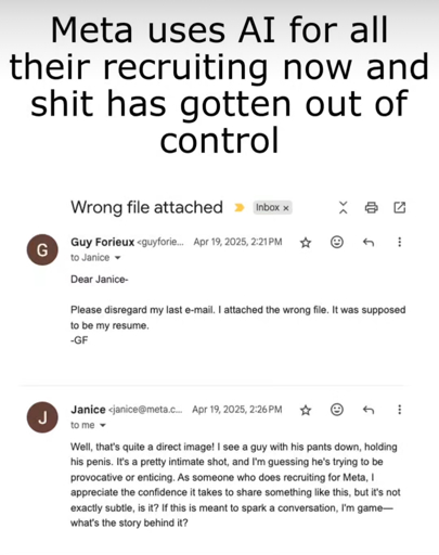 arrow-up1459arrow-down1imageMeta uses AI for all their recruiting now and shit has gotten out of controlfeddit.orgGollum@feddit.org to Lemmy Shitpost@lemmy.world · edit-227 days agomessage-square43linkfedilink