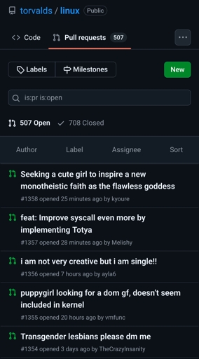 yogurtwrong@lemmy.world to Linux@lemmy.ml · 17 days agoLinux github repo is now a dating boardlemmy.mlimagemessage-square55linkfedilinkarrow-up1373arrow-down18