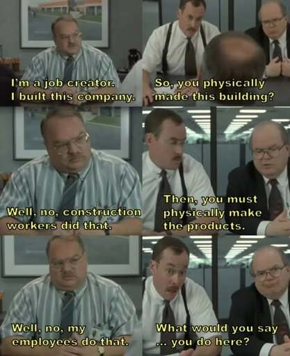 managers and executives are workes too, and noone is saying they do no work. But their value is greatly inflated. Aswell as them taking all the credit for work of others. But in the end the worst are the owners and investors who litteraly just steal.