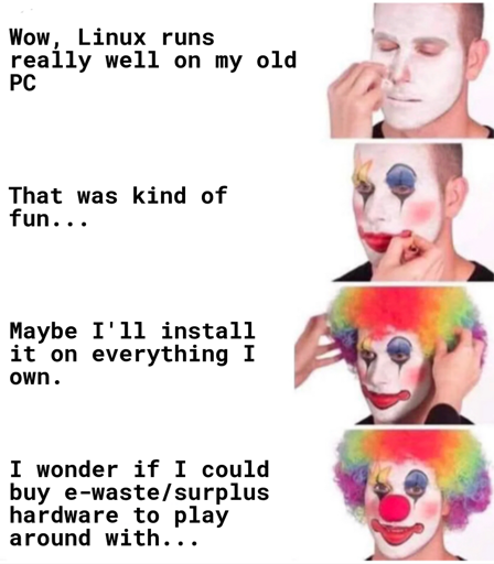 What? Don’t look at me like that! I totally need 70 computers! Yes they’re useful! They all have their purpose! That one? Its job is to be force-fed whatever weird obscure Linux distribution I just heard of! Oh, that one? That’s for testing Arch Linux configs on 25 year old hardware!
