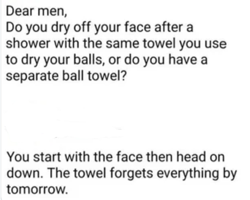 minus-square🍉 Albert 🍉@lemmy.worldlinkfedilinkarrow-up12arrow-down1·7 days agothis, if anyone os worried about the hygiene of towels, that means they aren’t confident on their shower. if you’re clean it doesn’t matter if your dry yer anus first.